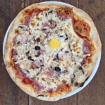 tomate, jambon, champignons, oeuf, mozzarella, olives