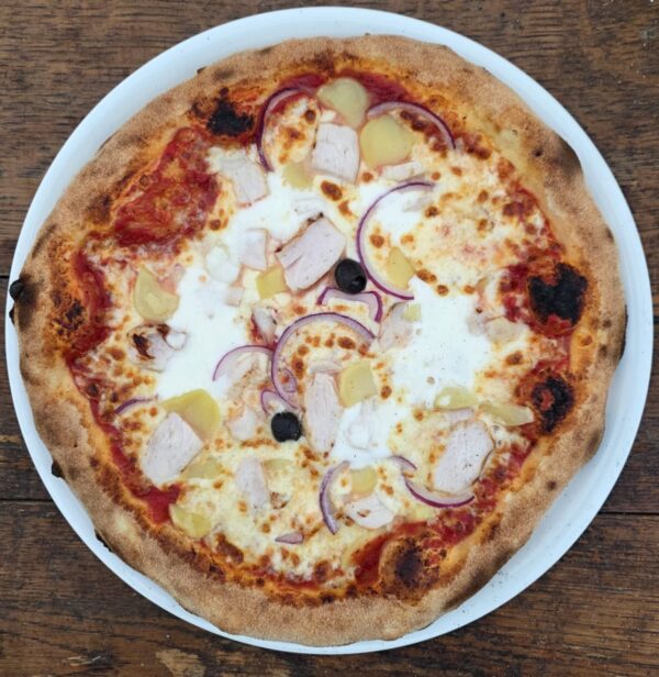 tomate, poulet, oignon, pomme de terre, crème, mozzarella, olives