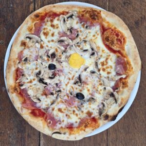 tomate, champignon, chorizo, poivron, crème, lardons, persillade, mozzarella, olives